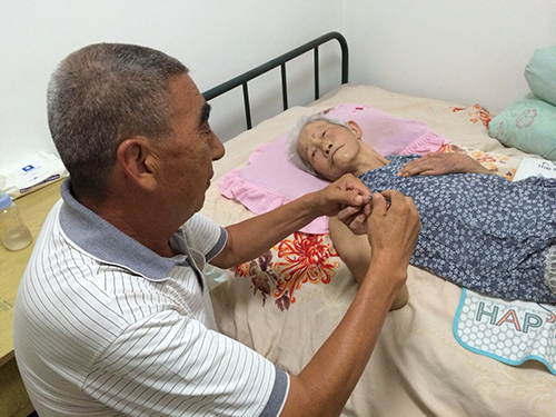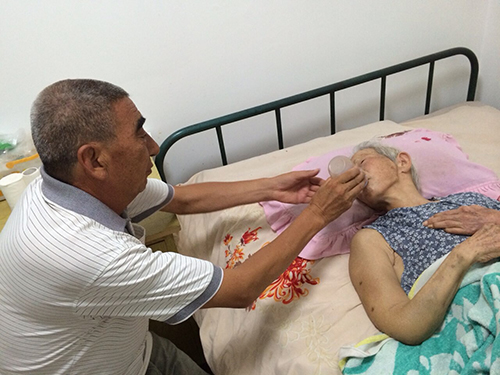 2012年9月的一个中午,岳母把股骨头摔断了,医生说老人岁数太大了只好回家静养,他听说房山坨里村有卖治疗骨折的好膏药,当即便坐车过去,回到家已是晚上8点,由于忘了吃药打胰岛素,身患糖尿病的他此时已经大汗淋漓,浑身直哆嗦。买回的膏药起了一些作用,但毕竟岳母的岁数大了,今后只能卧床了。老人牙口不好,每次吃饭都要把饭菜剁碎了喂给她,躺的时间长了,人也糊涂,有时不认人了甚至还要骂他几句,每次他只是笑笑说,这个老小孩儿。为了防止褥疮,他每天要给岳母擦拭两遍身体,涂上酒精和红霉素药膏。他还让孩子买了更舒适的尿垫和气垫床,平时经常给老人剪指甲、剪头发、洗澡,保持清洁,不让老人身上生一点味道。这些说起来容易,坚持做起来难上加难。