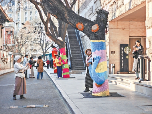 降雪前,东城区红星胡同的大树穿上“毛衣”,市民纷纷打卡。乔健摄